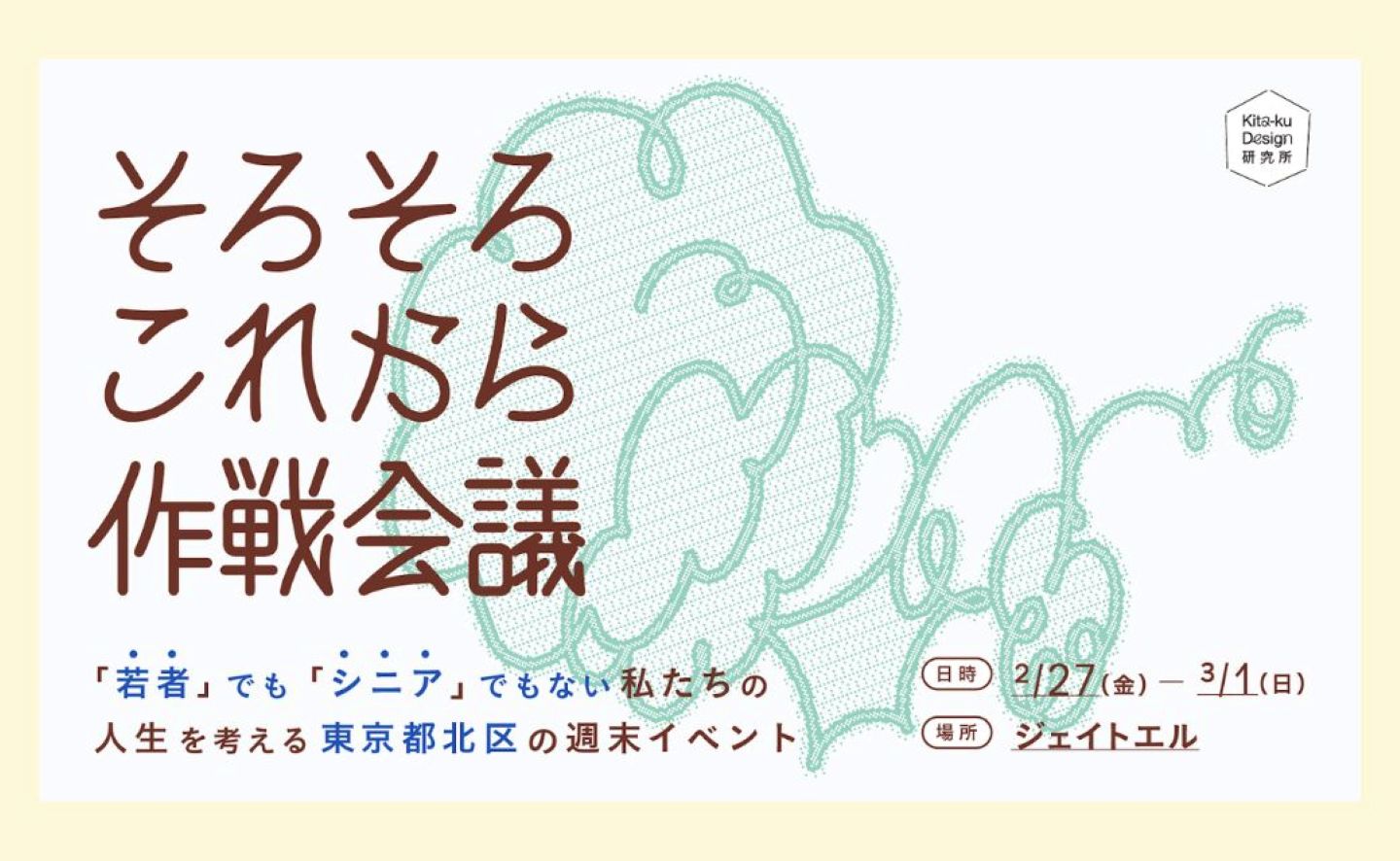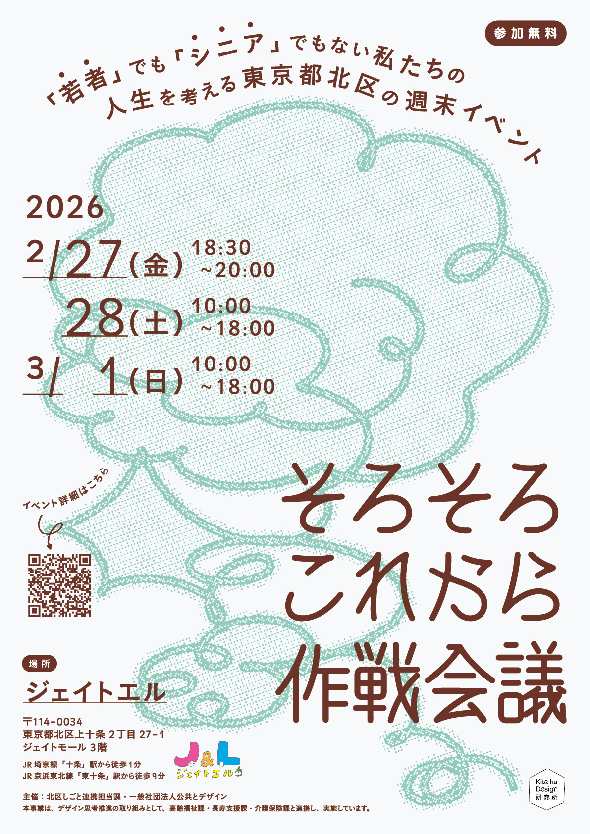 〈一般社団法人 公共とデザイン〉と〈東京都北区しごと連携担当課〉が共催する本企画は、50〜70歳前後の人生の転換期に差しかかる世代を対象としつつ、誰でも参加できるトークやワークショップ、体験型ブースなどを通して、自身のこれまでとこれからをゆるやかに見つめ直す場をひらきます。開催期間は2026年2月27日(金)〜3月1日(日)の3日間です。
