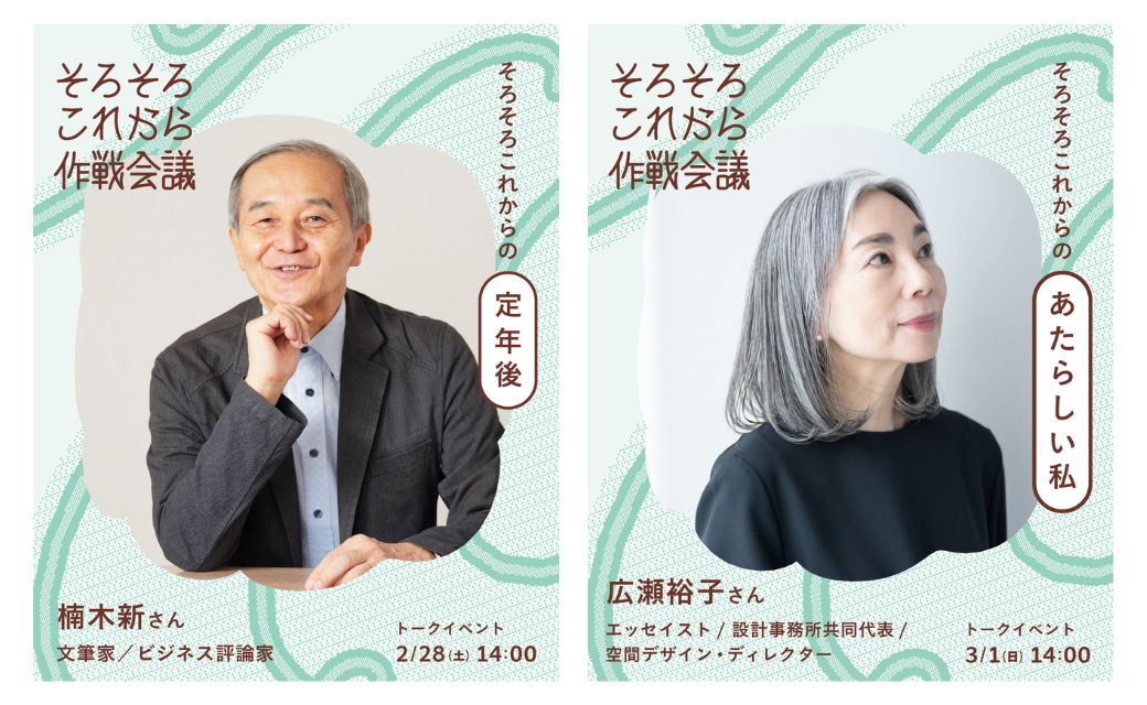 会期中は、多彩なプログラムが用意されています。まずは、「そろこれ世代」の先輩にあたる年代の方をゲストにしたトークイベント。2026年2月28日(土)には、25万部超えのベストセラー『定年後』(中公新書)を刊行した、文筆家でありビジネス評論家の楠木新さんが「そろそろこれからの”定年後”」をテーマに登壇します。