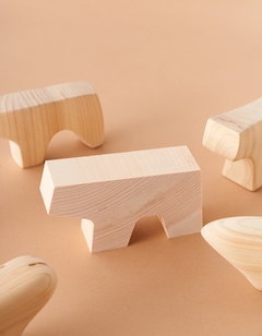 そして、子どもの玩具やオブジェとしても愛らしい「Alive」。ツルンと丸みを帯びたもの、カクカクしたもの、木の節や虫食いの跡があるもの。ひとつひとつ形状が異なる、世にふたつとない動物型の造形です。